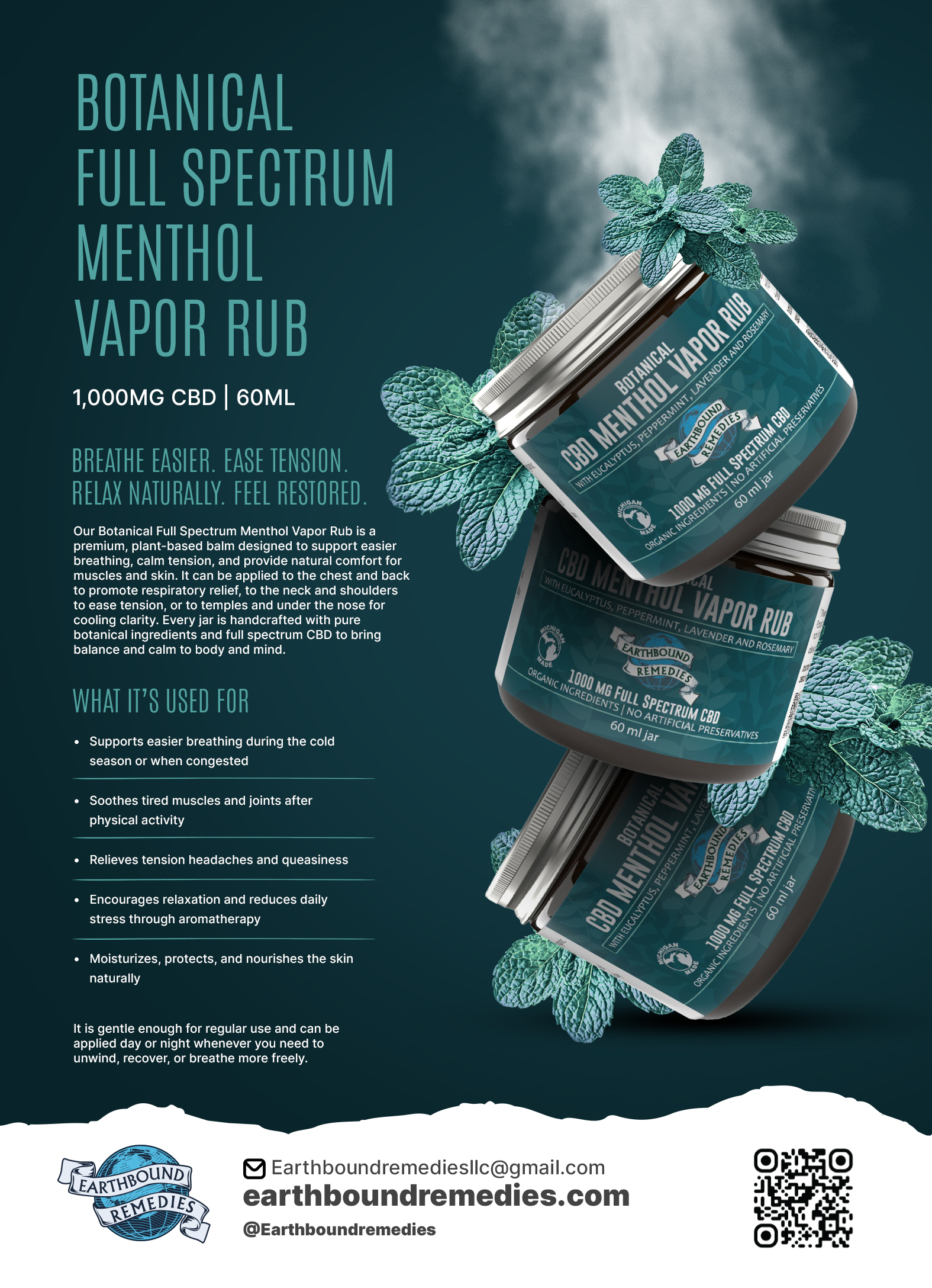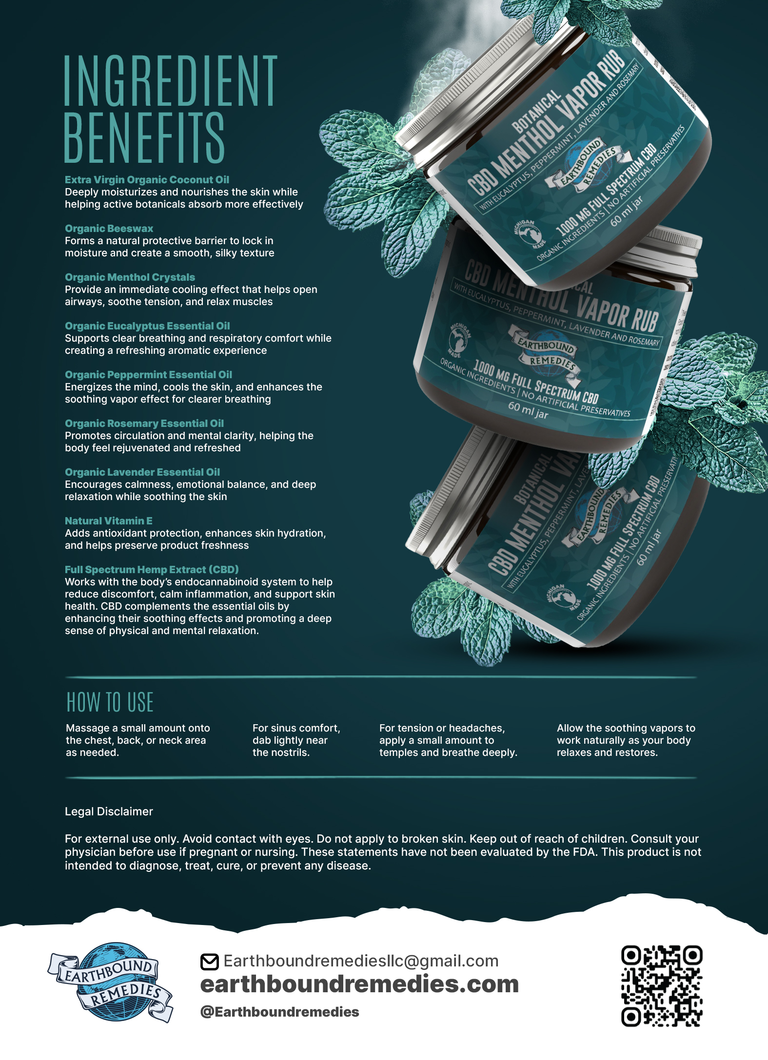 Ingredients: Organic Full Spectrum Hemp Oil Extract, Extra Virgin Organic Coconut Oil, Organic Beeswax, Organic Menthol Crystals, Eucalyptus Essential Oil, Peppermint Essential Oil, Rosemary Essential Oil, Lavender Essential Oil, Natural Vitamin E